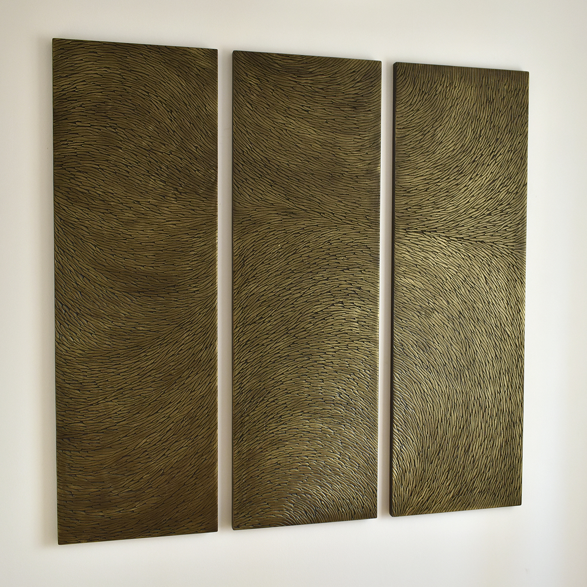 — Un travail à la fois physique et délicat qui mêle l’aspect masculin et féminin de sa démarche. Ses gestes sont précis et souples. Des courbes amples apparaissent laissant une empreinte de douceur dans une matière rude. Le mouvement orchestre et anime la matière. —